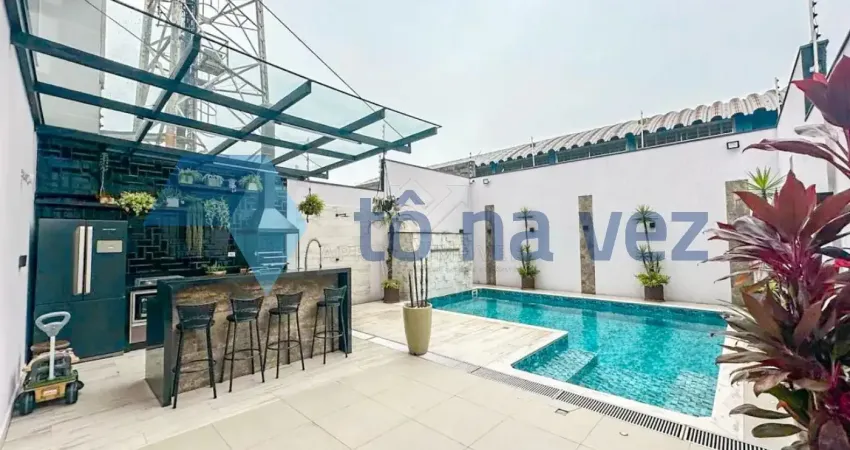 Sobrado 389m² à venda com 3 quartos sendo 3 suítes, 5 banheiros, 8 vagas, Piscina, Churrasqueira e armários planejados em todos os ambientes.
