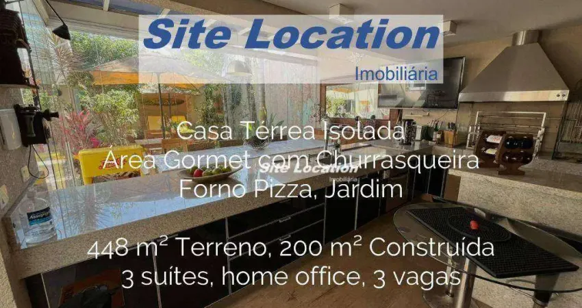 123386 Casa Térrea para Venda, isolada com 3 suítes e 3 vagas 19,15 x 23 - São 3 suites, uma com closet, uma sala de leitura, sala ampla (3 ambientes), hall de entrada, cozinha e lavabo. Canil, lavanderia, banheiro, home office, churrasqueira e forno de pizza bem grande com área com fechamento de vidro, garagem p 3 carros, corredor dos dois lados.