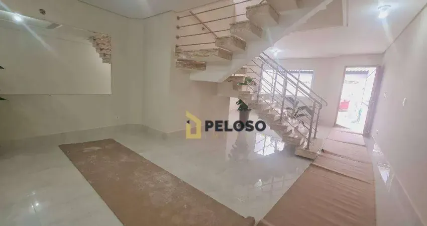 Sobrado recém-construído com 3 suítes, sala integrada à cozinha com ilha, balcão e pia em Silestone Blanco Stellar. Possui lavabo, despensa com prateleiras em granito e quintal com churrasqueira.