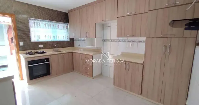 Lindo sobrado de alto padrão com 3 dormitórios com armários, sendo 1 suíte com box de vidro e gabinete, banheiro social com box de vidro e gabinete, sala dois ambientes com painel de TV, lavabo com gabinete, cozinha toda planejada com móveis de primeira linha, fogão cooktop e forno elétrico, área de serviço com armário fechado com porta envidraçada, quintal com área gourmet coberta com churrasqueira e pia, 2 sacadas envidraçadas, jardim de inverno coberta, sótão com móveis para escritório, 2 vagas cobertas e depósito.