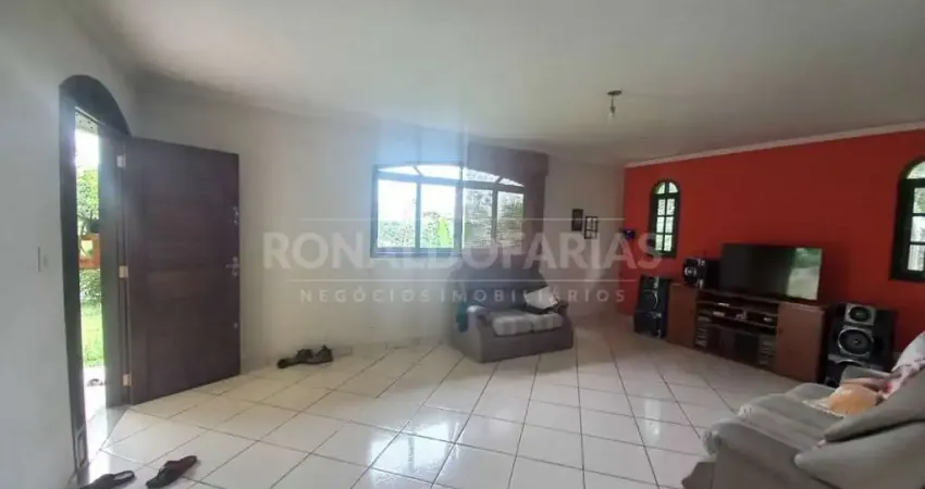 A casa principal dispõe de 2 dormitórios, sendo 1 suíte com banheiro em fase de construção, sala ampla e arejada, cozinha grande, varanda, área de serviço, churrasqueira, lago com peixes e garagem coberta para até 3 carros.