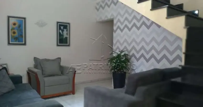 Sobrado com sala de estar, sala de TV, cozinha americana, banheiro social, 3 dormitórios sendo 2 suíte, varanda, área de serviço, churrasqueira e 2 garagens sendo 1 coberta.