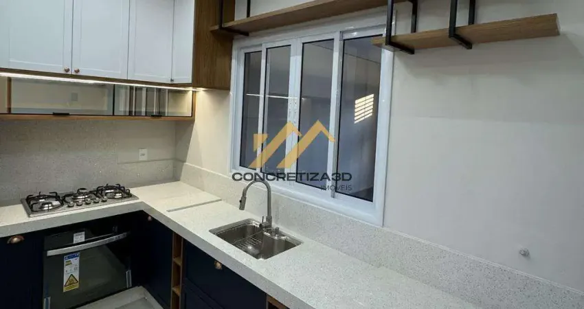 A sala de estar é integrada e acolhedora, perfeita para receber ou relaxar. A cozinha, totalmente equipada, conta com móveis planejados, geladeira Brastemp 3 portas, cooktop e forno a gás, além de bancadas em pedra Branco Estelar que elevam o padrão do espaço.