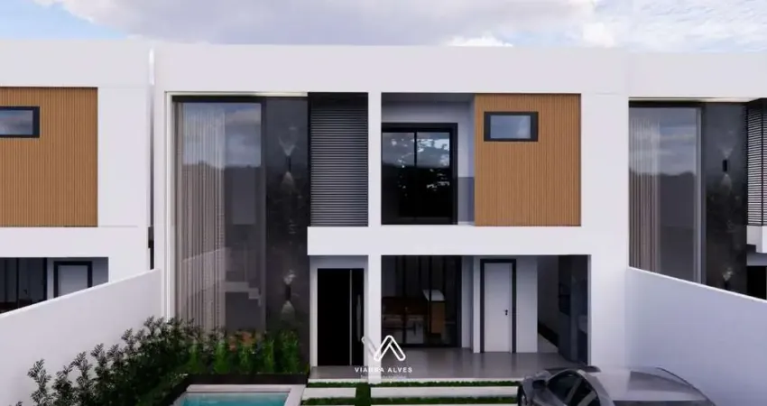No ambiente externo desfrute de um amplo terreno gramado com 185m² de área total e aproximadamente 115m² de área construída com vagas de garagem para 3 carros, churrasqueira e piscina.