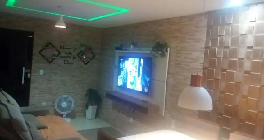 Casa sobrado: Sala dois ambientes com rebaixamento, 2 quartos sendo uma suíte, cozinha em porcelanato, banheiro social, varanda com lavarendeira e garagem para 2 carros. Terraço com espaço gourmet, com churrasqueira, bancada e janelas de blindex.