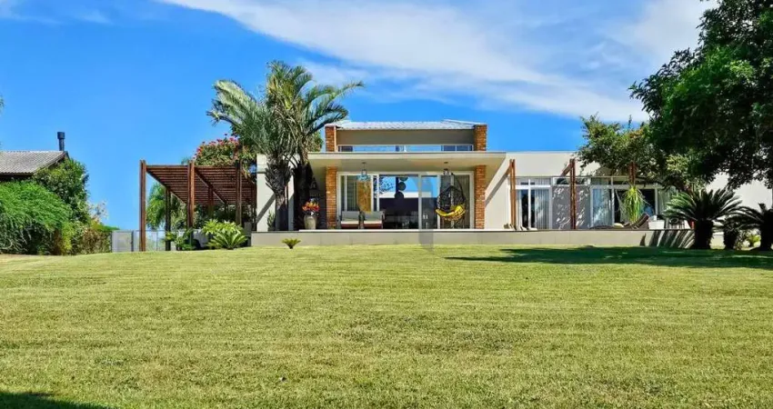 Casa com 4 dormitórios, sendo uma suite master e outra suite e os outros 2 quartos como Demi-suites, amplo living 3 ambientes com pé direito duplo, lareira, cozinha, lavabo e escritório. Ampla área de lazer com espaço gourmet com clareira e churrasqueira. Piscina e lindo paisagismo. Garagem coberta para 5 carros, lavanderia e dependencia completa. Condominio com segurança e estrutura de lazer. Venha e confira essa oportunidade, na frente do lago!