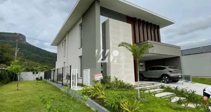 Casa no Condomínio Reserva da Pedra na Pedra Branca, Palhoça, oferece 275m² de área privativa com 4 suítes e 5 banheiros. O imóvel conta com 2 vagas de garagem, área de serviço, closet e acabamentos em porcelanato.
