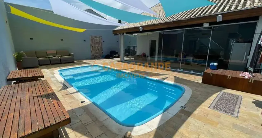 4 quartos (sendo 2 suítes) sendo 3 quartos com ar-condicionado; 2 Salas (sendo um mezanino); Área Gourmet integrada com a Cozinha e mezanino; som ambiente e independente na sala, mezanino, piscina e quarto superior; 1 lavabo; 2 banheiros social (sendo um na área gourmet próximo a piscina e outro no piso superior); Ventilador de teto em todos os ambientes; portão basculante na garagem; portão social independente; iluminação decorativa no quintal e jardim na calçada. Área de serviços; Vaga coberta para 2 carros e descoberta para 3 carros;