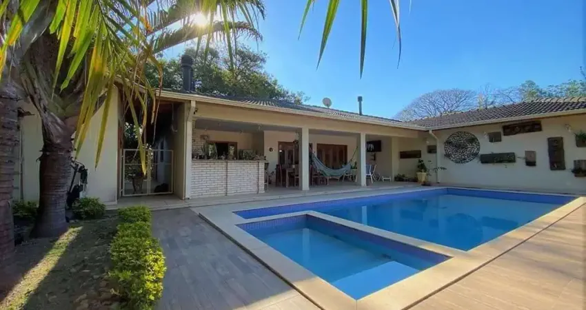 - Ótima casa TÉRREA com MUITO BOM acabamento e PLANTA VERSÁTIL para até 6 dormitórios (incluindo opcionalmente mais escritório e home theater).- Imóvel repleto de armários.- Portas e janelas em madeira e vidro.- Pisos em porcelanato, tabuas, granito, porcelanato rústico e cerâmica.- Frutíferas: laranja, limão Taiti e Rosa, goiaba, pitanga e manga.- Castanheira portuguesa e louro.- Horta com grande espaço.- Telha de cimento.- Louças e metais de qualidade.- 3 entradas: social, lazer e serviço.- Hall de entrada social.- Lavabo com bancada pia, espelho e gabinete.- Hall íntimo com 2 roupeiros / maleiros.- Escritório com bancadas e estantes, reversível para mais uma suíte americana adicional.- 4 dormitórios, sendo 3 suítes 2 com closets. A master com lareira, saleta e grande closet.- Banheiros com espelho, bancada, pia, box de vidro e detalhes em pastilhas, sendo a máster com bancada grande, 2 cubas e hidro.- Living para 4 ambientes voltados para varanda gourmet, quintal com lazer e jardim.- Salas de jantar, bar, estar e lareira.- Home theater reservado integrado ao living, com bancadas, estantes, porta de correr e reversível para mais uma possível suíte americana.- Varanda gourmet integrada ao living e piscina, para 3 ambientes com redes: churrasqueira, forno de pizza, bancada, pia, balcão e gabinetes.- Piscinas aquecidas solar (8m x 4m) adulto com escada interna e infantil (2,5m x 1,5m), com solarium, casa de máquinas distante e vestiário.- Espaço multiuso, ideal para salão de festas, jogos etc.- Copa cozinha repleta de armários planejados, bancada em U, fogão 5 bocas Brastemp Ative, coifa Fischer e despensa.- Área de serviço aberta e lavanderia fechada com tanque, ótimos armários e dependências de serviço.- Canil.- Porteiro eletrônico.- Portão automático.- Garagem para 3 vagas cobertas, mais grande pátio.- Aquecimento: Solar com suporte elétrico.- Abastecimento de água: Sabesp.- Armazenamento: 3.000 litros (2 caixas x 1.500 litros).