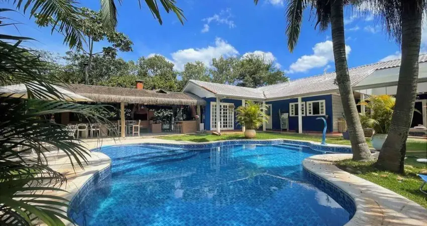 Vende-se sobrado no Condominio Dom Henrique III - Cotia* O Condomínio Dom Henrique III, fica na altura do Km 29 da Raposo Tavares.* Final de rua arborizada sem saída, tranquila e com vista.* Linda casa de campo contemporânea, toda avarandada, integrada e com bom acabamento.* A CASA É PRATICAMENTE TÉRREA, pós as escadas de acesso social, garagem / serviço.* Casa envidraçada, ensolarada e arejada.* Imóvel repleto de armários.* Portas e janelas e em madeira e vidro.* Pisos em porcelanato e cerâmica.* Louças e metais de qualidade. Com torneiras mono comando.* 3 entradas: social, lazer e serviço.* Hall de entrada social, por uma varanda com vista para o pesqueiro.* Lavabo com espelho e tampo de vidro.* Family room com ar-condicionado Q e F, entre os quartos.* 4 suítes amplas com closets + escritório (HOME OFFICE) + home theater.* Banheiros com espelhos, box de vidro, tampos e pias de vidro, sendo a master com 2 cubas, vaso isolado e hidro dupla.* Living para 5 ambientes com 2 lareiras, voltados para varanda e quintal com lazer e jardim.* Salas de estar, jantar, bar, lareira dupla face para 2 ambientes, uma das lareiras no home theater.* ANEXO GOURMET em Sapé, com churrasqueira, forno de pizza, fogão à lenha, bancada, 2 cubas, bar com bancada, pia e gabinetes e banheiro com lavatório externo.* Piscina em vinil com formato orgânico, iluminada, com escadas internas, prainha, cascata, solarium, ducha, piso atérmico, antiderrapante e casa de máquinas.* Copa cozinha repleta de armários planejados, grande parede com tijolos de vidro, bancada, ilha, balcão, gabinetes, despensa, guarda louças e vista para o lazer.* Área de serviço da cozinha com tanque.* Lavanderia no piso da garagem, com tanque, dependências de empregada e depósito.* SALÃO MULTIUSO - Com suporte de copa. Ideal para jogos, academia, estúdio, oficina e home office.* Porão para depósito do material da construção.* Horta.* 2 Canis.* Portão automático.* 3 Garagens com 7 vagas cobertas.* Aquecimento: Gás de passagem.* Abastecimento de água: Sabesp.* Armazenamento: 5.000 litros entre caixas e cisterna (link removido) JÁ SUA VISITA!!