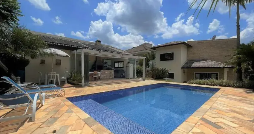 Estado de Conservação: ExcelenteIdade do imóvel: 2006- Linda casa contemporânea, muito confortável, integrada, com excelente acabamento.- Ótima localização na região e no condomínio. Topografia alta e próxima à portaria.- Casa envidraçada, ensolarada e arejada.- Imóvel repleto de armários.- Portas e janelas em madeira e vidro.- Pisos em porcelanato, granito e laminado.- Louças e metais Deca.- Telhas de concreto.- Jardim com paisagismo iluminado.- Frutíferas: jabuticaba, cajá-manga, lichia, mexerica Ponkan, mexerica Carioquinha, pitanga e limão.- 4 entradas: social, garagem, lazer e serviço.- Hall de entrada pela GARAGEM com acesso interno, espaço bicicletário e oficina.- Hall de entrada social pelo TERRAÇO com vista, guarda corpo de vidro e metal.- Lavabo com bancada em vidro.- Escritório / Home theater planejado.- Escada revestida em madeira com guarda corpo de vidro e metal.- 4 suítes com armários, ar-condicionados, sendo 2 com closets. A master com grande closet.- Banheiros com espelho, bancadas em vidro e box de vidro. Sendo a máster com hidro.- Living envidraçado para 5 ambientes, com pequeno desnível e pé direito duplo em parte, voltado para o quintal com jardim e lazer.- Salas de estar, lareira, TV, jardim de inverno e jantar.- Cozinha ampla toda planejada, com sala de almoço, bancada, 2 cubas e despensa.- Área de serviço aberta e lavanderia fechada com depósito, tanque e dependências de empregada ou hóspedes.- Anexo gourmet fechado com depósito e vestiário, todo envidraçado, com churrasqueira, bancada, pia, balcão e gabinetes. Perfeito para os dias de calor, frio ou chuva.- Piscina de alvenaria 3,5m x 7m, aquecida, com prainha, solarium, casa de máquinas.- Vestiário.- Espaço Multiuso. Ideal para escritório, atelier, jogos, música, oficina e academia, com entrada independente.- Garagem para 6 vagas, sendo 3 cobertas.- Geração de energia Fotovoltaica.- Aquecimento: solar com suporte elétrico.- Abastecimento de água: Sabesp.- Armazenamento: 4.000 litros (2 caixas x 2.000 litros).AGENDE JÁ SUA VISITA!!