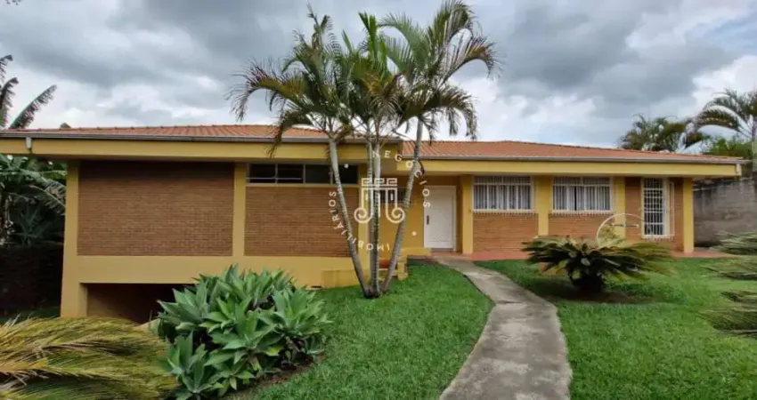 Casa à venda com 4 quartos sendo uma suíte com closet. Sala de estar ampla com sala de jantar e lareira, lavabo, cozinha espaçosa com armários, lavanderia e quarto de dispensa ao lado. Sala de televisão. Varanda com vista para o quintal que conta com campo de futebol, piscina, área de churrasqueira, vestiário com dois banheiros completos e canil. A casa tem acesso por duas ruas, tanto pela parte da frente quanto pela parte de trás.