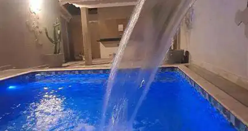 Piscina com hidromassagem, cascata e iluminação.