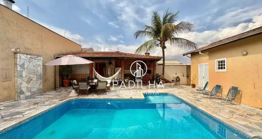 Casa térrea com 4 dormitórios, sendo 2 demi-suíte, e a master com closet e hidromassagem, sala 3 ambientes, cozinha fechada planejada, despensa, lavabo, lazer com área gourmet com churrasqueira, vestiário, piscina, área de serviço, quintal, paisagismo, 4 vagas de garagem. Ótima localização, próximo a City Pão.