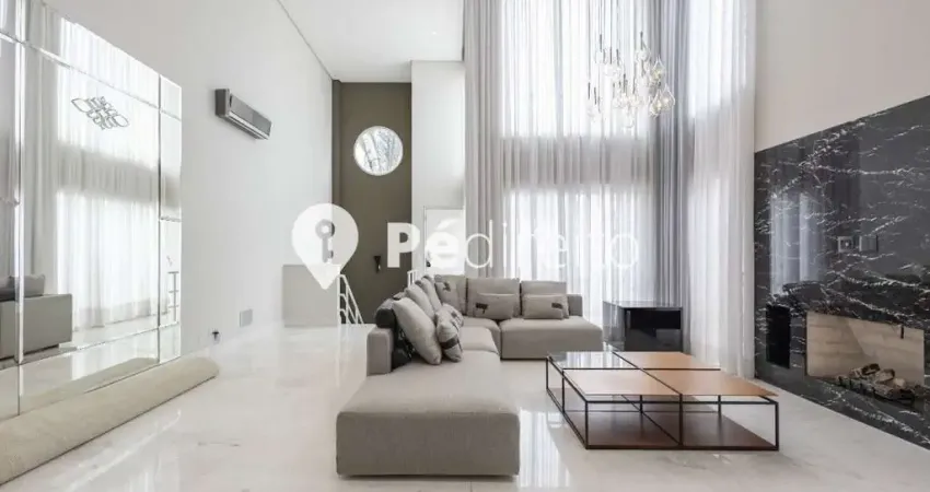 Living imponente com pé direito duplo e lareira, integrando-se harmoniosamente à sala de jantar.