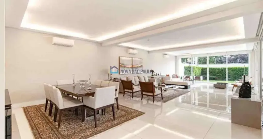 Sala para três ambientes integrada, bem iluminada, equipada com ar condicionado e grandes portas de vidro que proporcionam entrada de luz natural e integração com a área externa com agradável jardim, ideal para momentos de convivência, lazer e descanso.