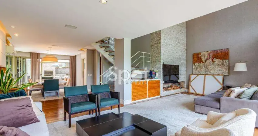 Alto luxo! Planta moderna e diferenciada com jardim espaçoso e terraços. Provida de muita luz natural em todos os ambientes. Ar condicionado. Espaçosa sala de estar com pé direito duplo e lareira - sala de jantar com acesso ao jardim - churrasqueira - lavabo - 4 dormitórios sendo 3 suítes - closet - pavimento superior com sala íntima, banheiro e terraço com piscina e sauna. 3 vagas de garagem.