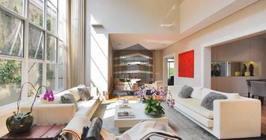 No pavimento inferior, living com pé direito de 7 metros com ar condicionado;