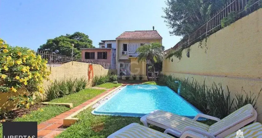 Excelente sobrado com 240² divididos em 2 pavimentos e mais anexo, em terreno com 435m² (6,60x66m). Possui no térreo: living amplo para 2 ambientes com sala de estar com lareira e sala de TV, escritório/dormitório, lavabo, sala de jantar, cozinha americana espaçosa e jardim de inverno e lavanderia. No andar superior possui: 3 dormitórios sendo 1 suíte com closet, todos com sacada, e banheiro social. Living com piso tabuão e piso laminado nos dormitórios. Água quente na cozinha e banheiros. Na área central do terreno possui pátio com gramado e piscina. Nos fundos anexo com lindo apartamento de 1 dormitório, sala, cozinha e banheiro. E ainda mais ao fundo pátio com pomar. Garagem fechada para 2 carros e mais uma vaga em frente na rampa. Imóvel com peças amplas, bem ventiladas, super iluminado com sol manhã e tarde. Localizado em ótima região, a poucos minutos do Hospital Mãe de Deus, do Zaffari da Getúlio, com todos os recursos próximos. Aceita financiamento e FGTS. Solicite mais informações e agende já uma visita. Estudamos seu imóvel no negócio. Além deste, mais de 25 mil opções em nosso site.