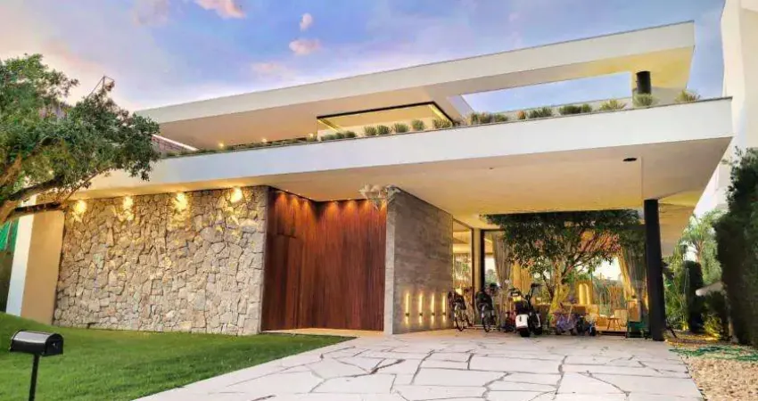 Composto por 5 suítes independentes, sendo 01 suíte master e 01 suíte térrea, mobiliado e decorado, Dependência de empregada, Living com 02 ambientes, Lareira, Lavabo, Cozinha integrada, Churrasqueira, Depósito, Lavanderia, Varanda com churrasqueira, Amplo pátio, Deck, Piscina com Spa, Abrigo para carro.