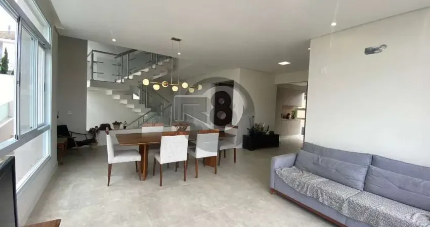 No pavimento térreo, ampla cozinha com moveis planejados integrados, sala com 2 ambientes, lavabo, sala de TV com lareira, além de garagem com 3 vagas, sendo 2 cobertas.