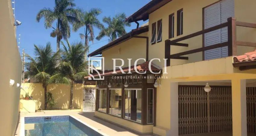 Lindíssimo sobrado composto por sala de jantar, sala de TV, escritório, lavabo, cozinha, lavanderia, despensa, 5 dormitórios sendo 3 suítes, banheiros, mezanino, cozinha gourmet com churrasqueira e forno à lenha para pizza, piscina, amplo espaço de quintal e garagem para 4 carros.