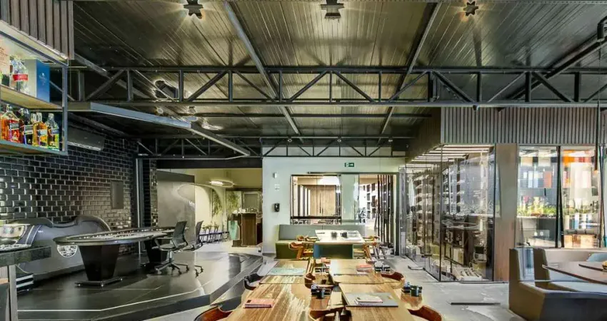 Ao entrar, você é recebido por um amplo salão iluminado, com acabamentos de alta qualidade que valorizam o teto em metal exposto e as paredes revestidas com azulejos brilhantes, conferindo um toque moderno e marcante.