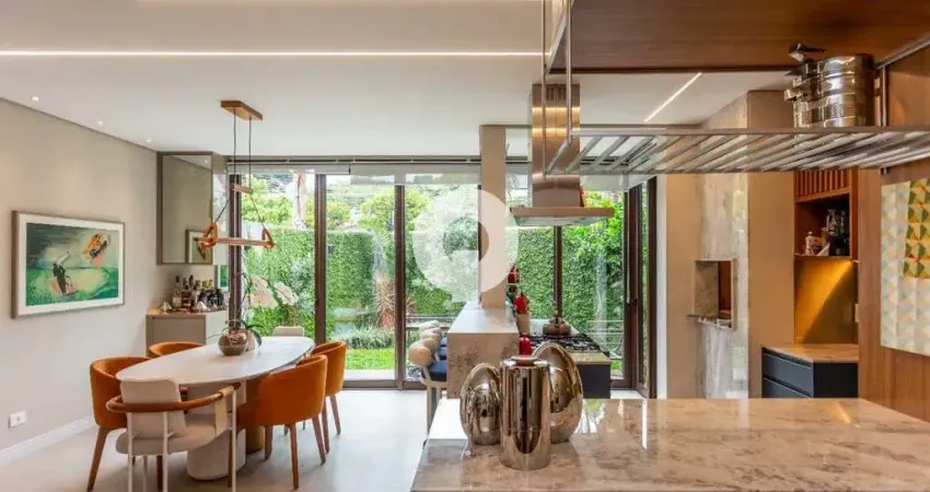 Townhouse em condomínio pequeno no Mercês, com 150 m² de área privativa, face norte, ambientes integrados e ar-condicionado em todos os ambientes. Projeto com marcenaria sob medida, jardim e duas vagas paralelas no subsolo com depósito.