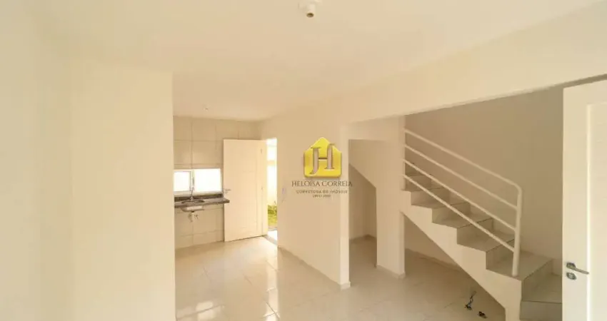 Casa duplex com 65,62 m² de área construída, com sala de estar e jantar, banheiro social, cozinha, área de serviço, terraço/varanda e garagem aberta.