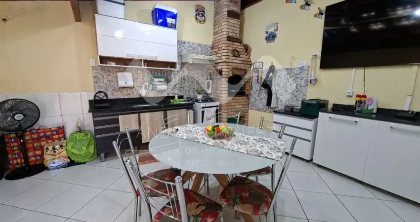 Com 77 m² de área construída, este sobrado conta com uma sala ampla com dois ambientes, lavabo, cozinha com planejados, lavanderia coberta, área gourmet com churrasqueira e armários, corredor lateral. São 2 dormitórios com sacada no piso superior, banheiro social e garagem para 2 veículos.