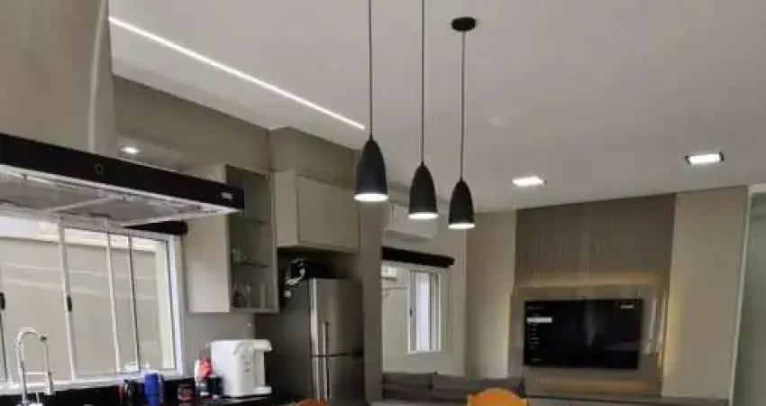 Sala integrada à cozinha gourmet, totalmente planejada e com mesa acoplada