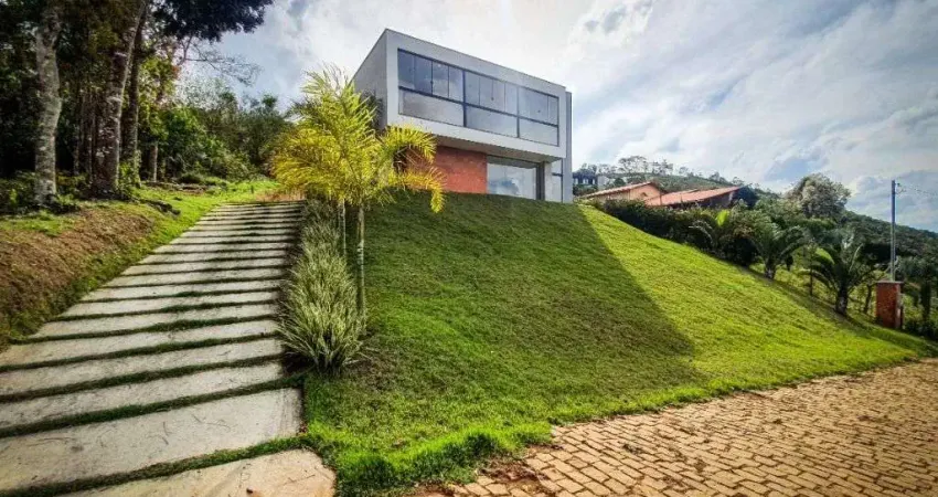 Sou uma fantástica casa no Estrada Real, vivo em contato com a natureza e tenho uma vista exuberante que mais parece um quadro.São 350 m² distribuídos em 2 pavimentos, sendo no primeiro sala 2 ambientes com a fachada envidraçada com a mais bela vista para o horizonte, cozinha impecável com ilha e espaço gourmet com churrasqueira e forno de pizza... contando com um lavabo e 1 banheiro além de um depósitoNo segundo pavimento são 3 suítes com closet e vista para o verde da natureza.
