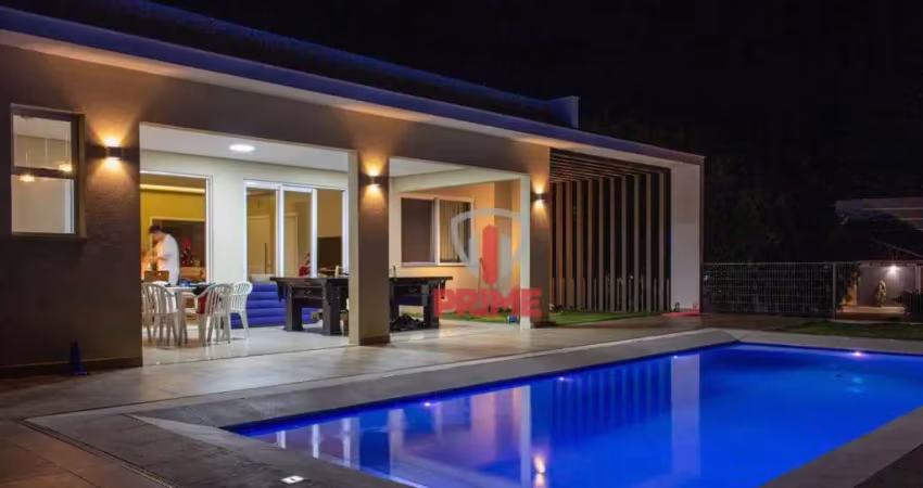 Casa à venda no condominio terras de Canaã na Gleba Fazenda Palhano em Londrina. - Com três quartos sendo duas suítes uma master, sala, cozinha, área de serviço, dois banheiros sociais, nove vagas de garagem sendo três cobertas. - Desing moderno, acabamento rico em pedras, travertino, quartzo, excelente estrutura, pintura alta resistencia, piso porcelanato acetinado e vinilico 4 mm com encaixe click. - Painel TV alto até o teto com iluminação, aquecimento solar, aquecimento biodigestor. - Piscina com piso borda refratária e ralo linear. - Armários embutidos, mesa de bilhar, churrasqueira, Janelas de ótima qualidade, com tela mosquiteiro. - Suíte master com banheira hidro, revestida de mármore travertino, cabeceira da cama com iluminação, blackout com controle.