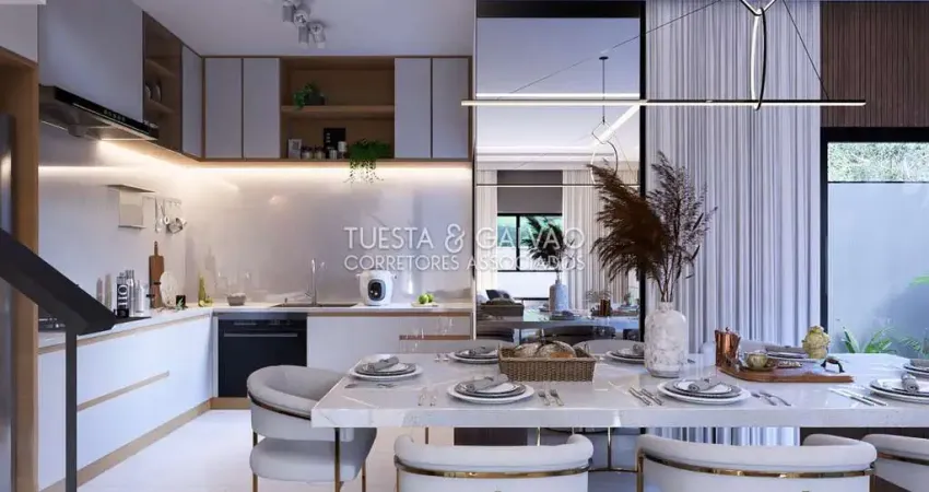 No térreo, a sala para dois ambientes integra-se harmoniosamente à cozinha em conceito aberto, criando um espaço moderno e acolhedor. A área de serviço é separada da cozinha, garantindo funcionalidade ao dia a dia. O espaço conta ainda com vaga para dois carros e churrasqueira, ideal para receber familiares e amigos.