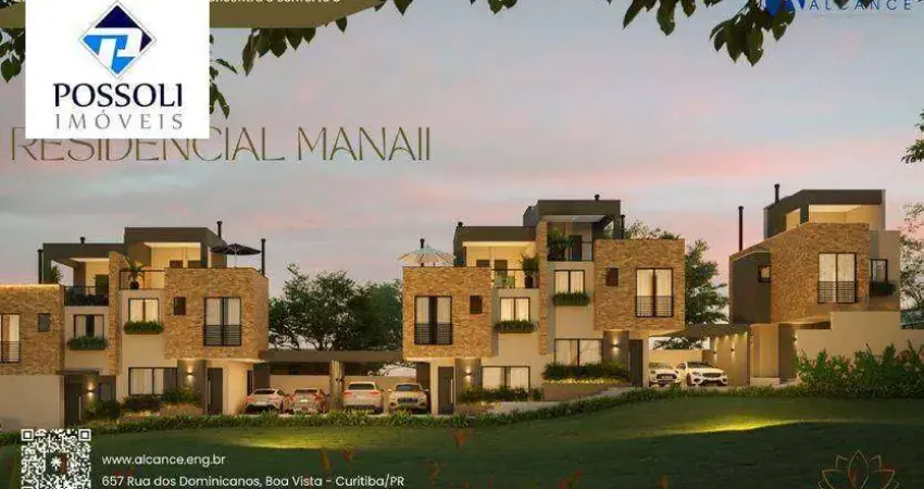 Sobrados 03 dormitórios, suíte em Condomínio Fechado Manaii , Bairro Boa Vista, Rua Dos Dominicanos, 657, a uma quadra da Rua Holanda. Condomínio com 05 unidades, sendo 01 frente para Rua e 04 unidades internas, com área construídas aproximadas de 145,00 m2 incluindo a área de terraço descoberto. Sobrado 05 condomínio fechado Não Geminado, tem área construida coberta de 122,71 m2 e área de terraço descoberto 19,52 m2. As vagas de garagem são paralelas, pé direito alto na sala e dormitórios. Infraestrutura de ar condicionado sala e dormitórios. Venezianas automatizadas nos dormitórios, piso em porcelanato sala e dormitórios, escada em mármore ou granito. 02 churrasqueiras uma fica no piso térreo e outra no terraço descoberto. PAV. TÉRREO: Sala estar e jantar, lavabo, cozinha conceito aberto, área de serviço, vagas paralelas 02 veículos. PAV. SUPERIOR: 03 Dormitórios, sendo uma suíte, banheiros sociai. PAV. ATICO: Sala/ Escritório. Banheiro completo, terraço com churrasqueira. Previsão de entrega Junho 2026 Valores a partir de R$ 877.300,00 (sobrado 05) Entrada de 10% e saldo parcelado até entrega obra direto com a Construtora. Saldo final através de financiamento Bancário ou quitação recursos próprios. Mais informações e agendamento de visitas, favor ligar 41- 9 Jose Possoli ou 41- 9 Elaine Possoli