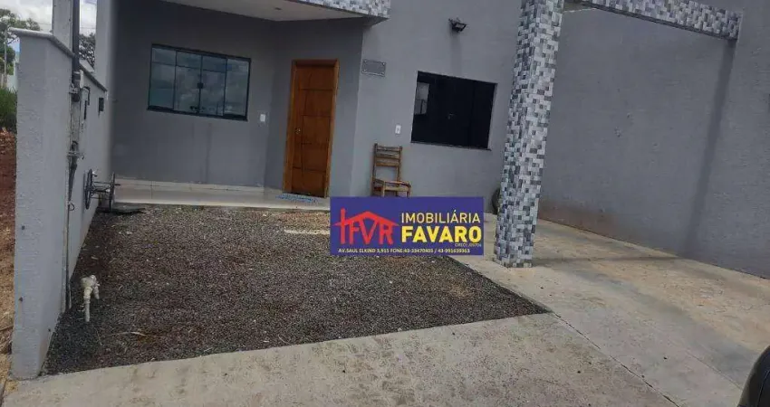 Casa contendo três quartos, sendo uma suite, sala ampla, cozinha, wc social, área gourmet com churrasqueira e garagem.