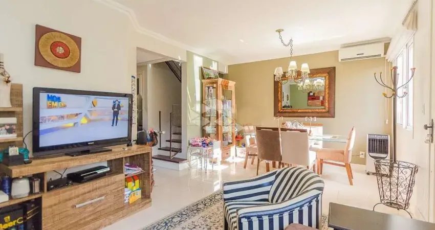 Casa em condomínio fechado com 118 m², 3 dormitórios, 1 suíte, living 2 ambientes, lavabo, cozinha planejada, churrasqueira, terraço com piscina e 2 vagas.