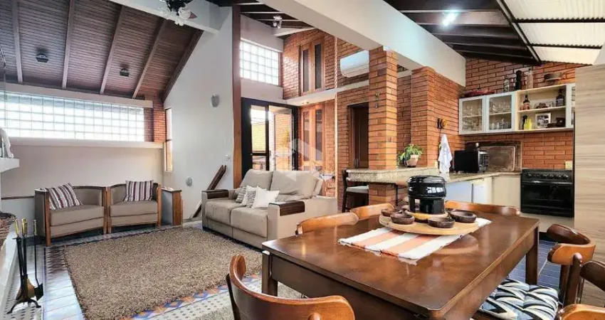 No andar principal, a casa tem uma excelente integração entre a sala de jantar e a sala de estar, equipada com uma lareira a lenha, além de um lavabo, cozinha planejada com bancada de granito e área de serviço.