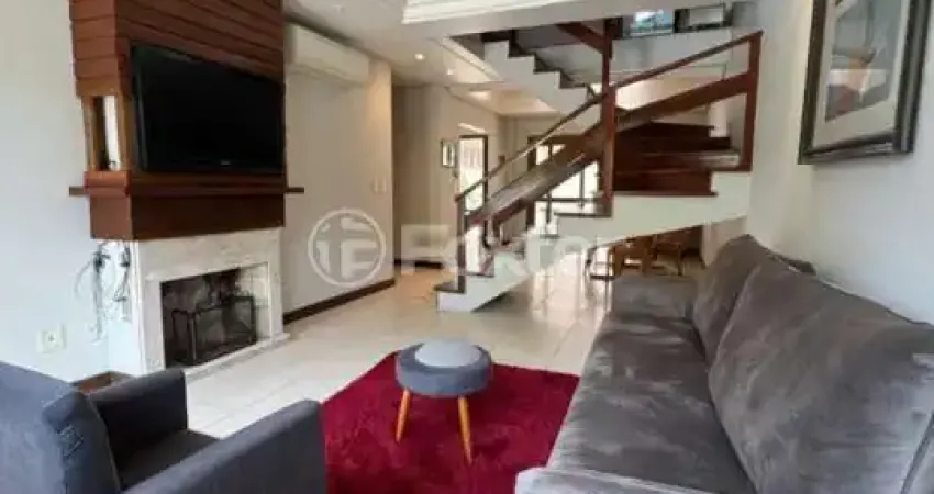 Excelente casa sobrado totalmente mobiliada: 3 dormitórios, uma suíte com banheira de hidro, sacada em todos 3 dormitórios, living dois ambientes com lareira, cozinha montada com geladeira, fogão , micro ondas e móveis planejados, lavabo, sala de estar com lareira e painel com TV, sala de jantar com mesa e 4 cadeiras, estante e armários, espaço gourmet fechado com churrasqueira, sacada de frente e terraço, sótão espaçoso com vista, pátio nos fundos, 2 vagas de garagem sendo uma coberta. Localização próximo á orla do Guaíba e portaria 24 horas.