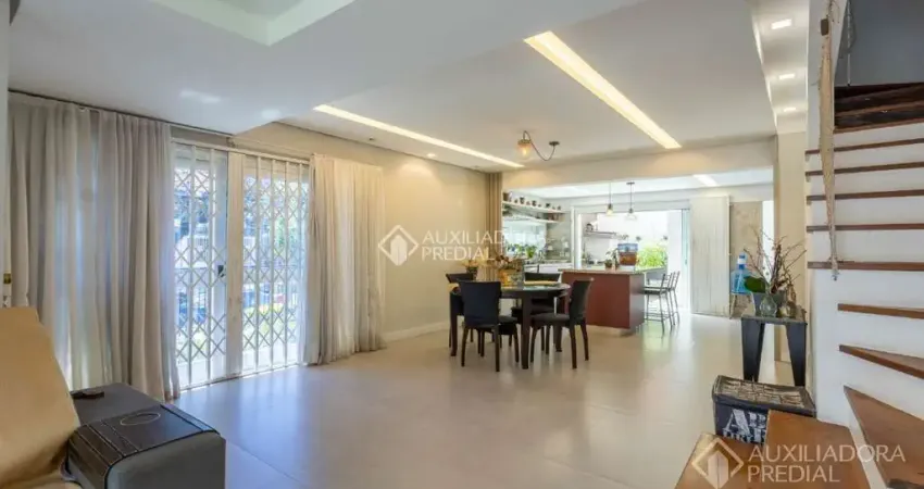 Belíssima casa em condomínio fechado, ensolarada, arejada, vista livre! Conta com 231 m2 bem distribuídos em 4 pavimentos: No subsolo ficam 3 vagas de garagem cobertas; No térreo, o living para 2 ambientes com piso em porcelanato e aquecido, mais a cozinha integrada, lavabo, lavanderia e área; No primeiro andar, 3 quartos, sendo uma suíte com sacada; total de 4 banheiros na casa; Na cobertura, salão de festas com churrasqueira, lavabo, sacada e terraço com vista livre, panorâmica! Conta com Gás Central! Aproveite essa oportunidade única no bairro, próximo a comércios, escolas, e toda a comodidade que o imóvel oferece!