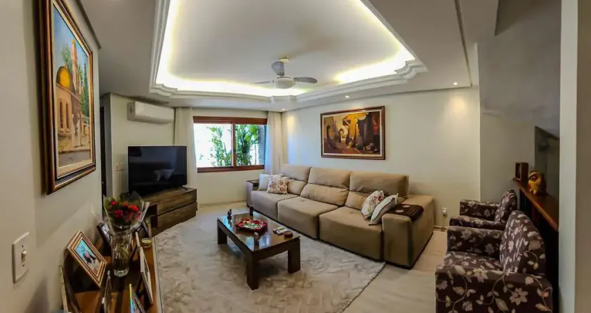 Impecável, com 3 dormitórios, sendo 1 suíte master com closet, mais um banheiro social, living para 3 ambientes, lavabo, cozinha americana com móveis planejados, área interna com churrasqueira, piso cerâmico. No 3° pavimento, sótão com lareira, banheiro e terraço com vista para o Guaíba. Pátio com piscina, dependência de empregada com banheiro e lavanderia. Garagem fechada para 3 carros. Imóvel quitado, documentação OK. Condomínio tranquilo, com portaria virtual e sistema de segurança, bem próximo da Wenceslau Escobar. Agende logo sua visita!!