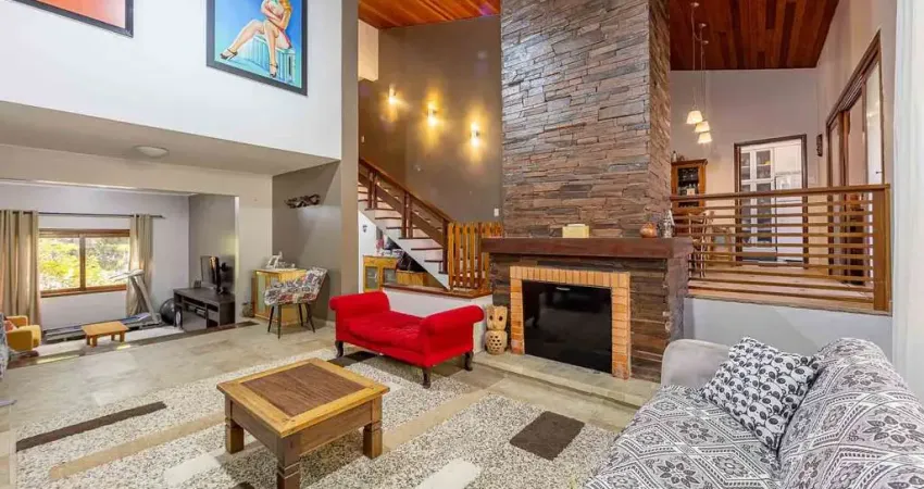 O hall de entrada leva a um living imponente com pé-direito elevado, distribuído em três ambientes, equipado com lareira e lavabo, ideal para receber com estilo e conforto. A área gourmet com churrasqueira é integrada ao pátio com piscina, criando um ambiente perfeito para lazer em família e confraternizações.