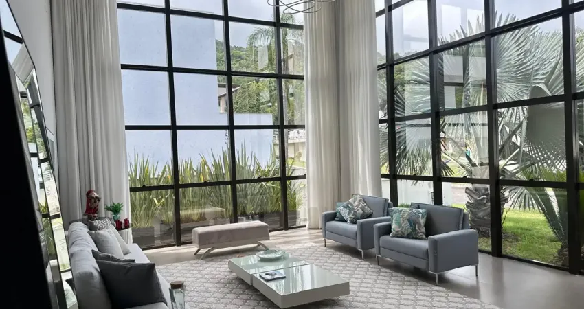 Com área total de 701,15 m² e área privativa de 346,32 m², a casa conta com 3 dormitórios, sendo 3 suítes, e banheira hidromassagem na suite principal. Dispõe de cozinha americana, sala de tv, escritório e lavabo. Oferece vista panorâmica, espaço de lazer com churrasqueira, imóvel mobiliado, ar-condicionado, área de serviço e 2 vagas de garagem.