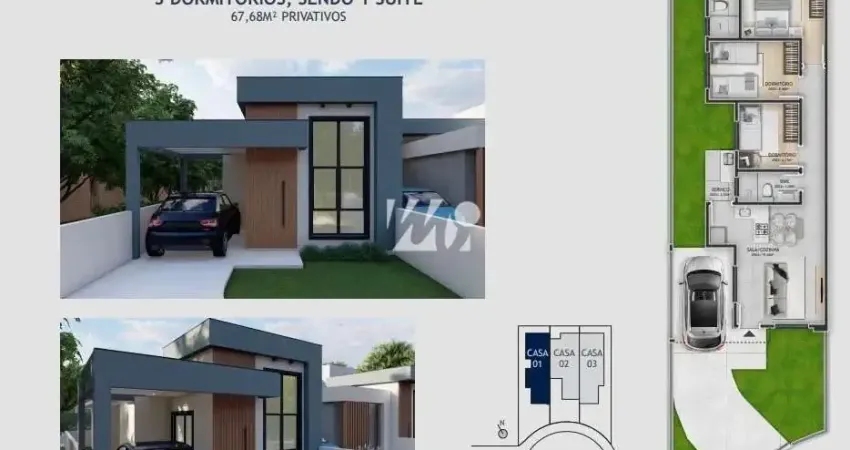 Casa geminada 3 dormitórios sendo 1 suíte, 68m², em Nova Palhoça. Imóvel novo, entrega em 2025, com suíte, vaga coberta e acabamentos modernos. Escritura pública registrada e documentação completa para financiamento bancário. Ótima opção para quem busca conforto, praticidade e qualidade de vida.