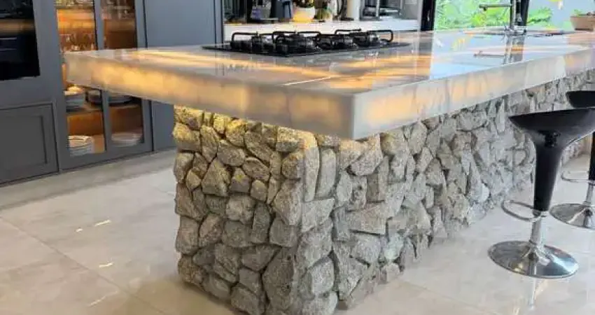 •Ilha central em granito Ônix com iluminação embutida;