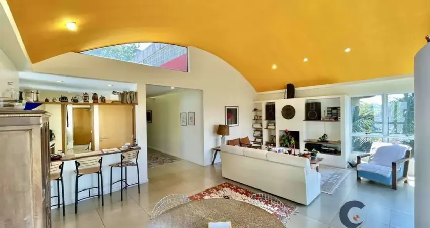 O living principal conta com 3 ambientes amplos (sala de jantar, estar com lareira e TV), todos voltados para um terraço com vista panorâmica. A cozinha americana é equipada com armários planejados e se integra de forma fluida ao ambiente social e à garagem.