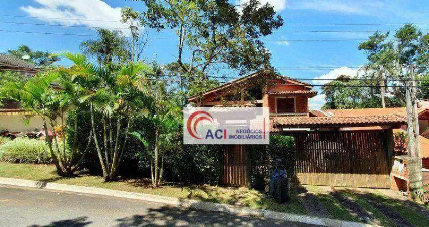 Casa em condomínio fechado com sala de estar com lareira e pé direito alto, sala de jantar, cozinha, são 3 dormitórios, sendo 1 dormitório no piso superior com sacada, 1 suíte máster e 1 dormitório no piso inferior com sacada, banheiro, mezanino, lavanderia, quintal com Um belo canil.