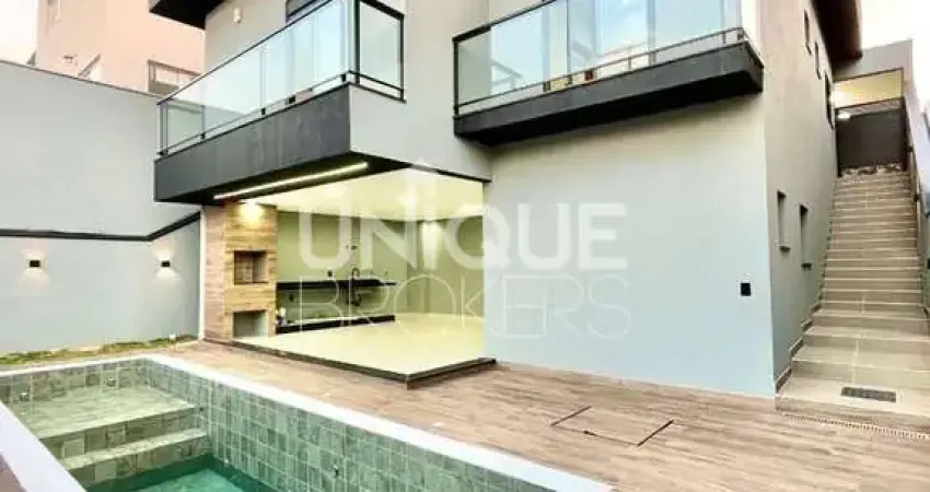 3 suítes, sendo uma máster com closet, sala com pé direito duplo, trazendo ainda mais amplitude e elegância, área gourmet independente com piscina e banheiro, perfeita para receber amigos e familiares, cozinha e ambientes com acabamento em porcelanato de alta qualidade, esquadrias em alumínio preto linha Gold, que combinam modernidade e robustez, garagem para 4 carros, sendo 2 cobertas