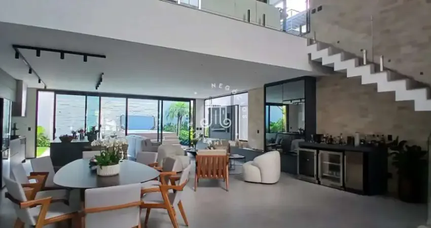 Casa de alto padrão, recém-construída, com 310 m², distribuída em três suítes (uma no térreo e duas no mezanino, sendo uma master com closet), ambas as superiores com sacada interligada. Sala com pé-direito duplo integrada à jantar; cozinha planejada com ilha e cooktop, integrada ao espaço gourmet com churrasqueira e sala de TV. Possui lavabo, despensa e área de serviço.