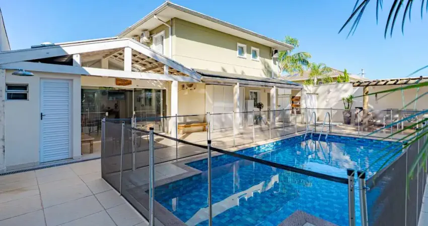 Diferenciada das demais pelo extenso quintal com piscina, pois é casa de esquina sem vizinhos aos fundos, e vista para a mata. Conta com aquecimento solar para chuveiros e torneiras. Placas fotovoltaicas para geração de energia solar. Área gourmet envidraçada com ar condicionado. Piscina aquecida, ducha e lavabo no quintal.